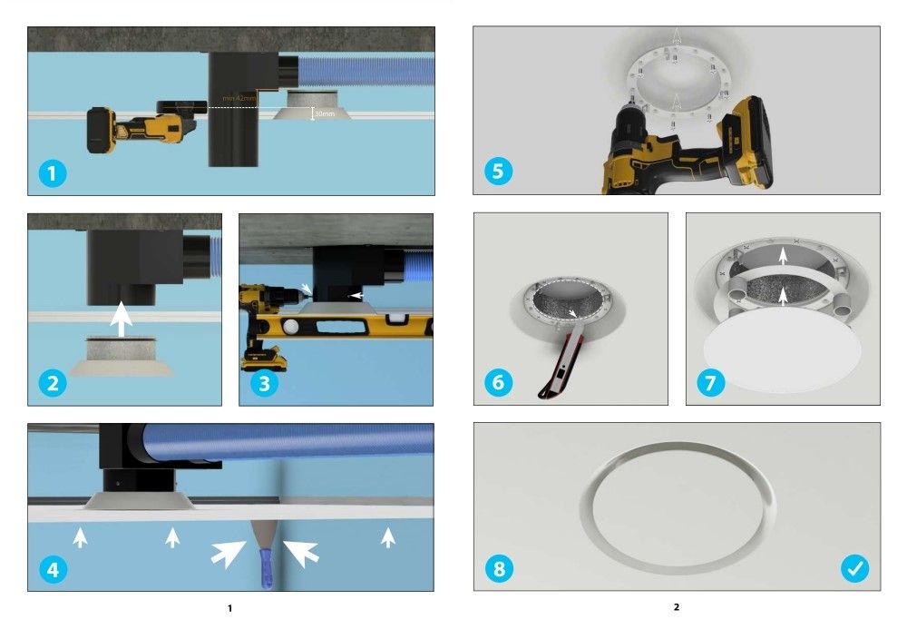 • Lengvai priderinamas dizainas – baltos spalvos tekstūrinis dangtelis dera su standartinėmis įtempiamomis lubomis, o esant poreikiui gali būti padengtas plėvele arba perdažytas.