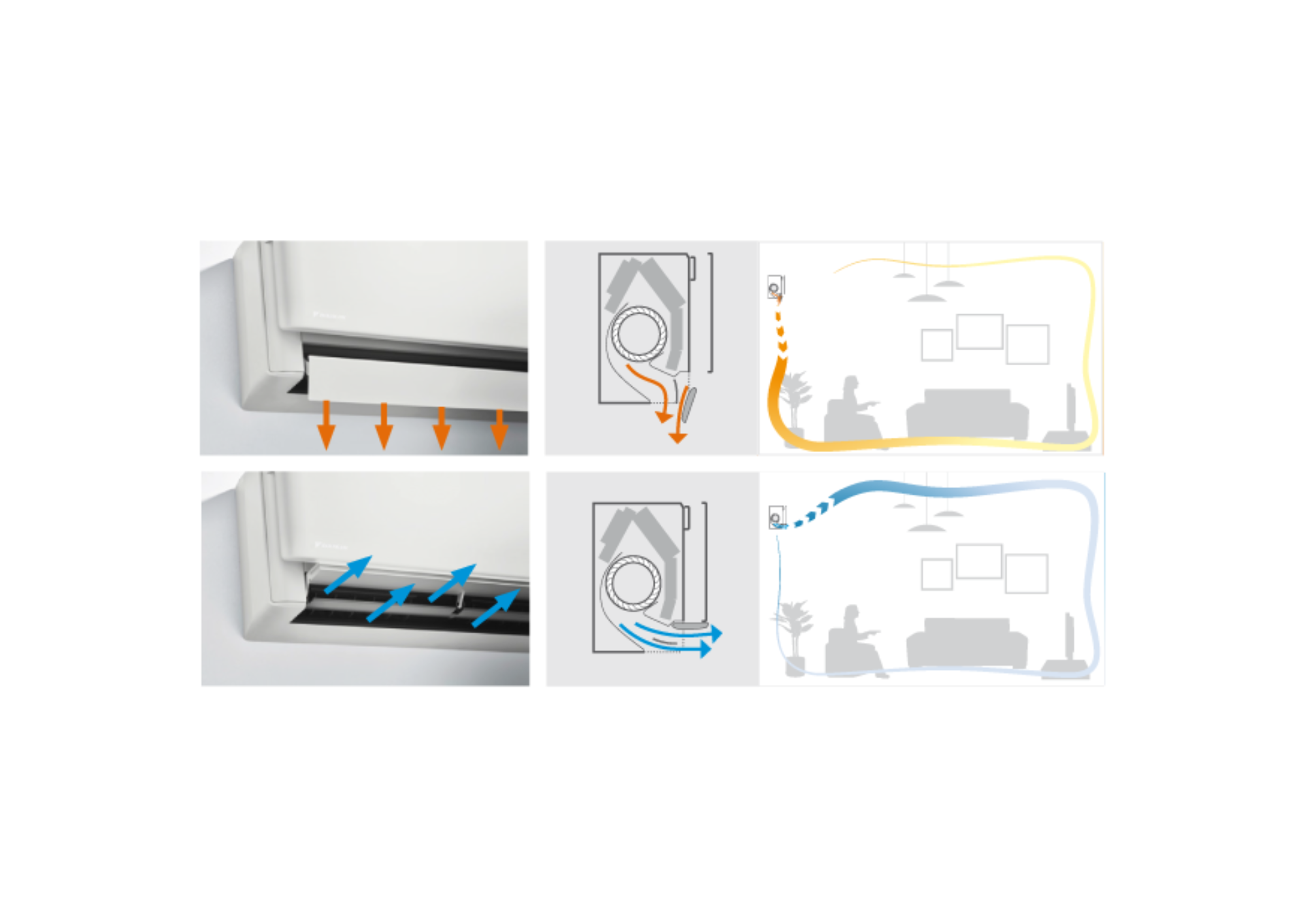 Išmanusis terminis Daikin jutiklis nustato esamą patalpos temperatūrą ir tolygiai paskirsto orą visoje patalpoje nukreipdamas šiltą arba vėsų orą į reikiamas vietas, o Koanda efekto sistema užtikrina optimalų oro srauto pasiskirstymą patalpoje be nemalonaus skersvėjo dėl specialiai suprojektuotų menčių.