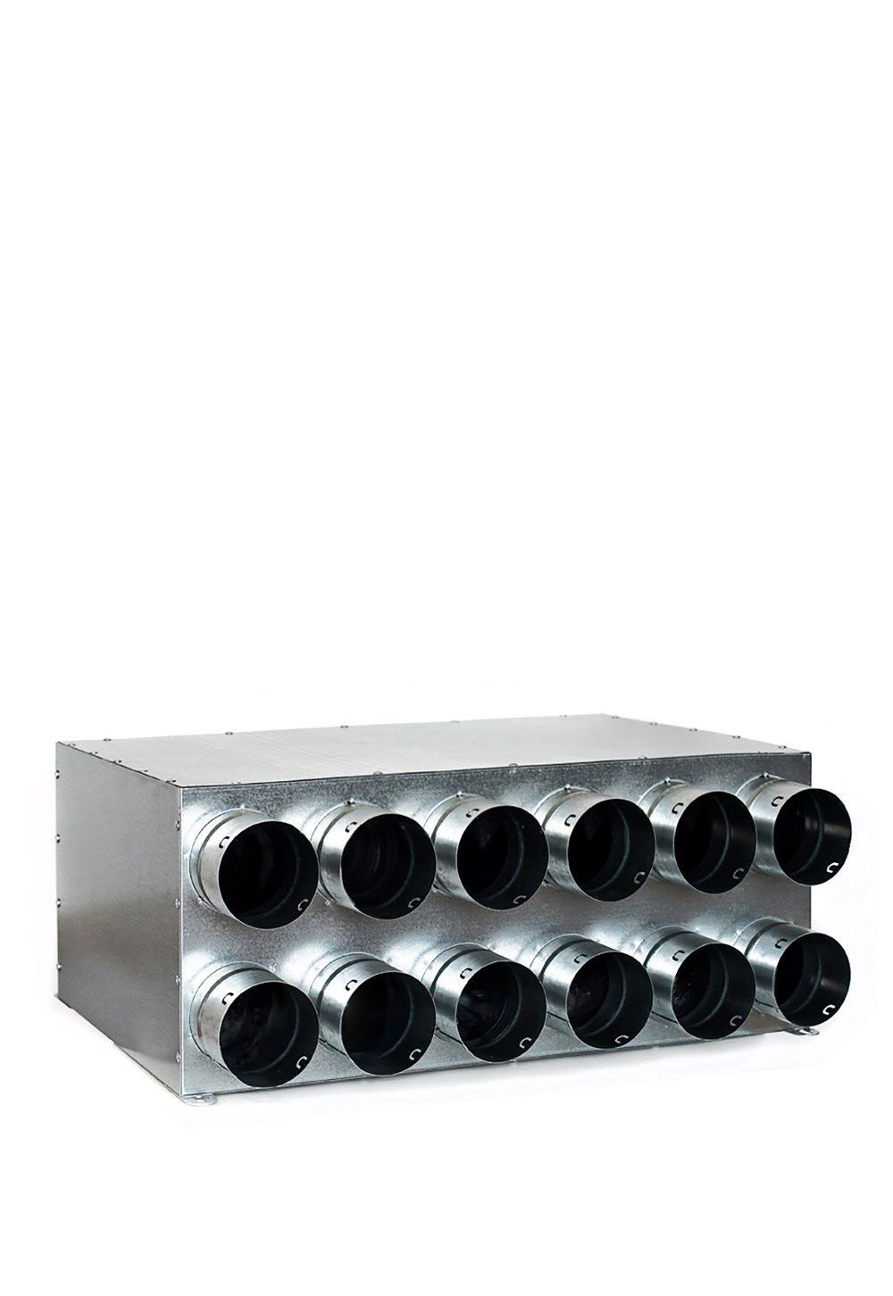 Kolektorinė oro paskirstymo dėžė viduje su antikondensacine KFLEX izoliacija ir oro srauto paskirstymo pertvaromis.