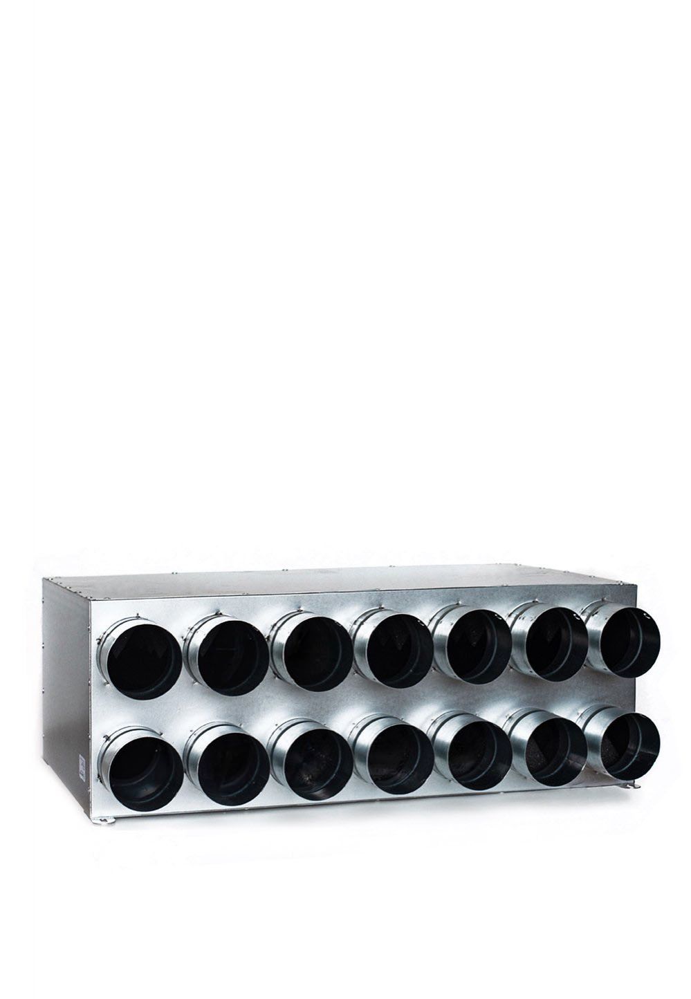 Kolektorinė oro paskirstymo dėžė viduje su antikondensacine KFLEX izoliacija ir oro srauto paskirstymo pertvaromis.