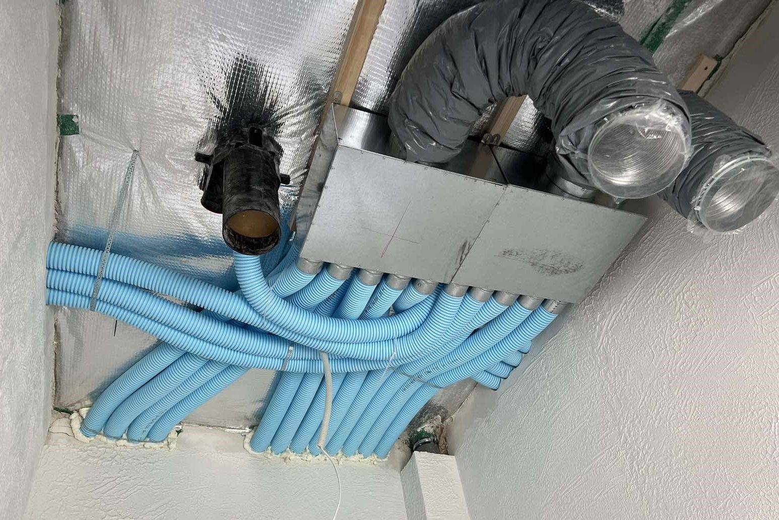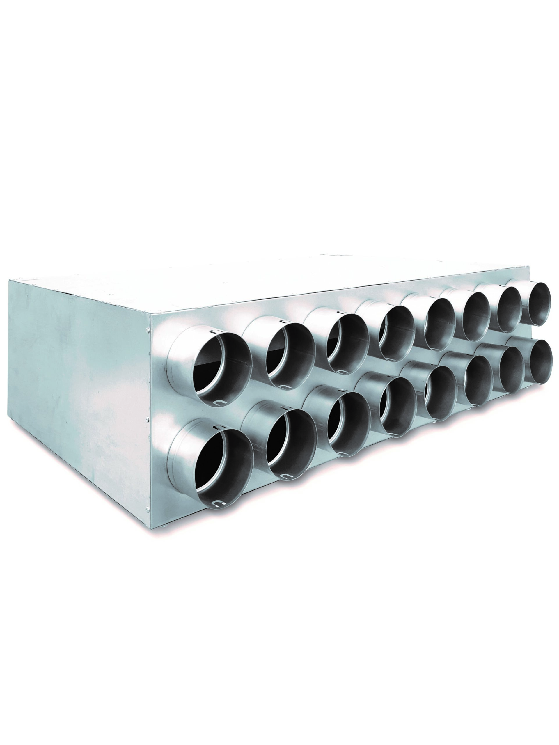 Kolektorinė oro paskirstymo dėžė viduje su antikondensacine KFLEX izoliacija ir oro srauto paskirstymo pertvaromis.