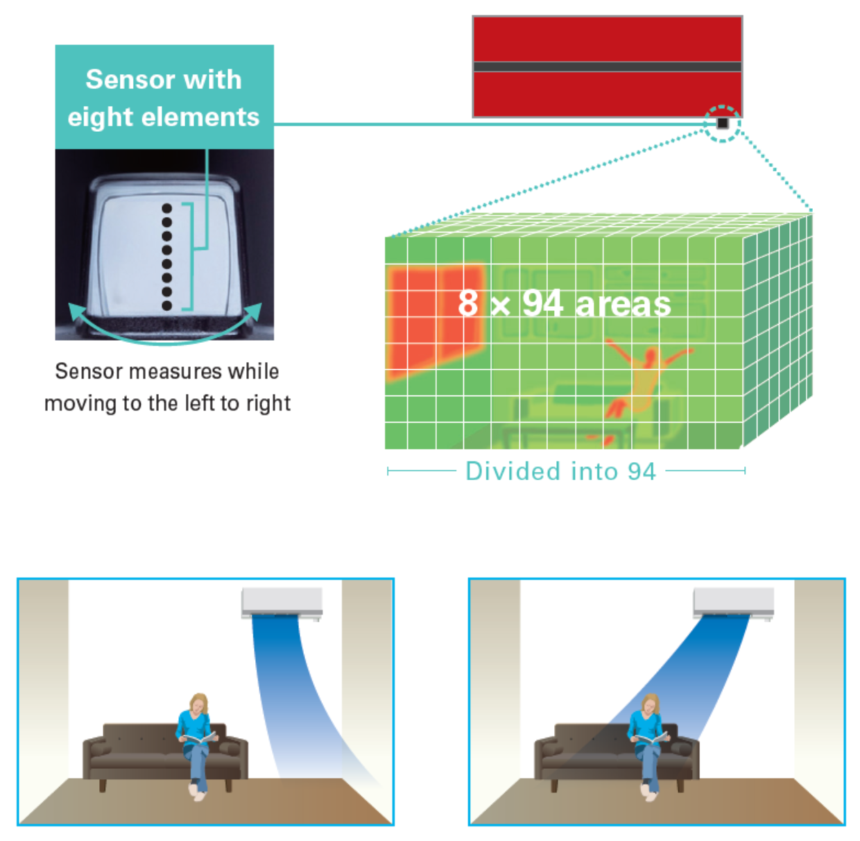 MSZ-RW serija turi 3D „i-see“ jutiklį, tai yra infraraudonųjų spindulių jutiklis, kuris matuoja temperatūrą visoje erdvėje. Judant į kairę ir į dešinę, aštuoni vertikaliai išdėstyti jutiklių elementai analizuoja kambario temperatūrą trimis matmenimis. Ši išsami analizė leidžia nuspręsti, kur patalpoje yra žmonių, todėl galima sukurti tokias funkcijas kaip „netiesioginis oro srautas“, kad kondicionieriaus vėjelis pūstų ten, kur žmonių nėra, o funkcija „tiesioginis oro srautas“ nukreipia orą ten, kur pagal jutiklio signalą nustatoma žmonių buvimo vieta.