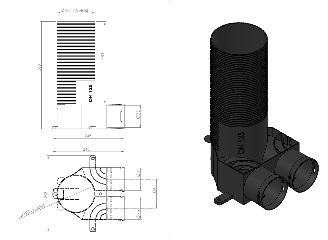 Atvamzdžio ilgis 283 mm, 2 x 75 mm pajungimas.