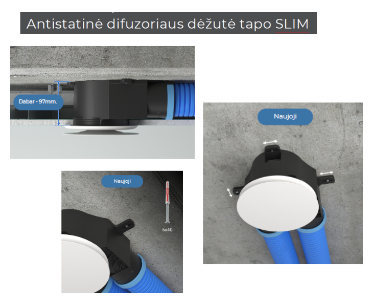 Atnaujinta vidinė difuzoriaus dėžutės forma, priimtinesnė įvairių tipų difuzoriams ir leidžianti dar labiau sutaupyti lubų aukštį!